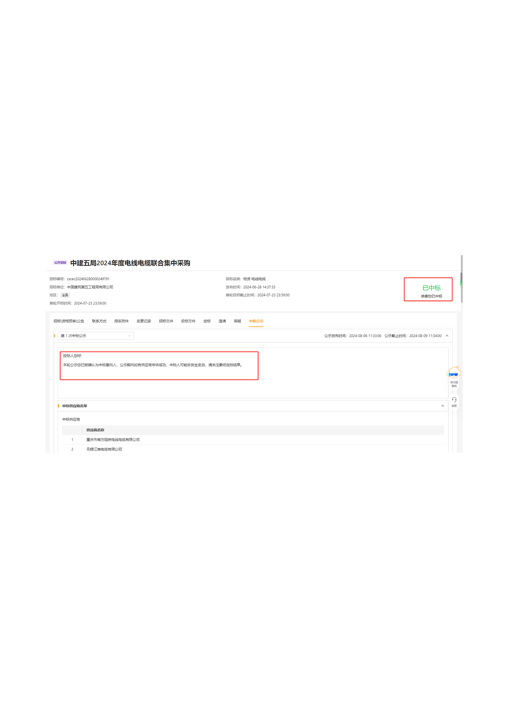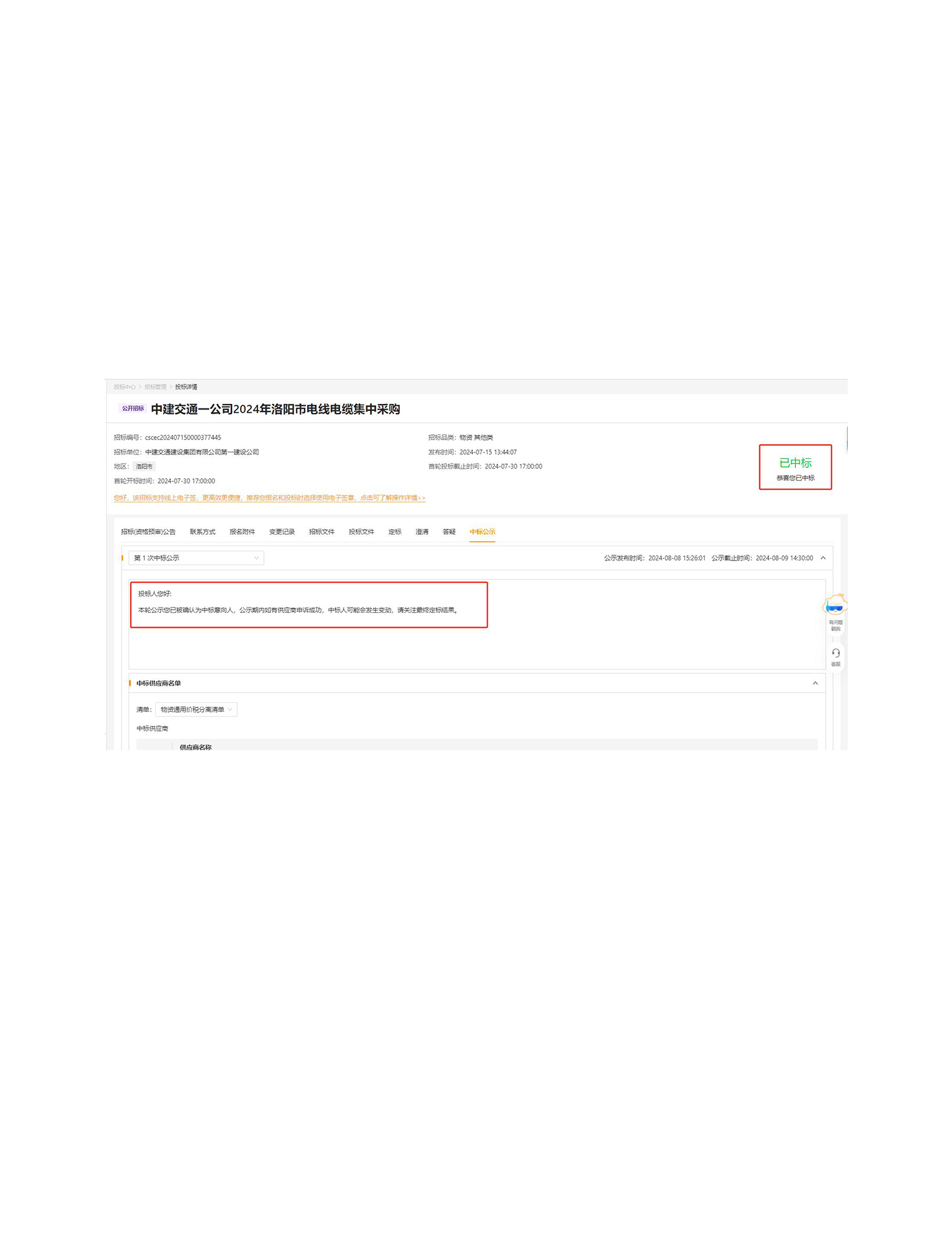中国建设通信第一公司2024年洛阳市电线电缆集中采购中标通知