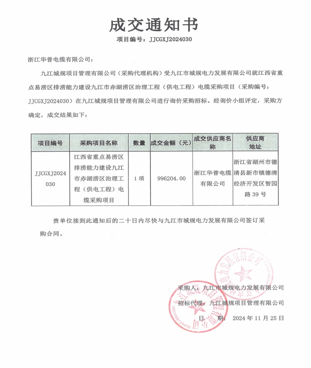 江西省重点防洪区排水建设九江吉娃娃防洪工程(供电工程)电缆采购中标通知