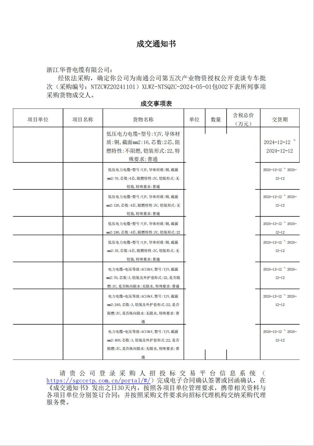 (高低压投标中标通知)南通公司第五次工业材料授权公开投标专用车辆批次