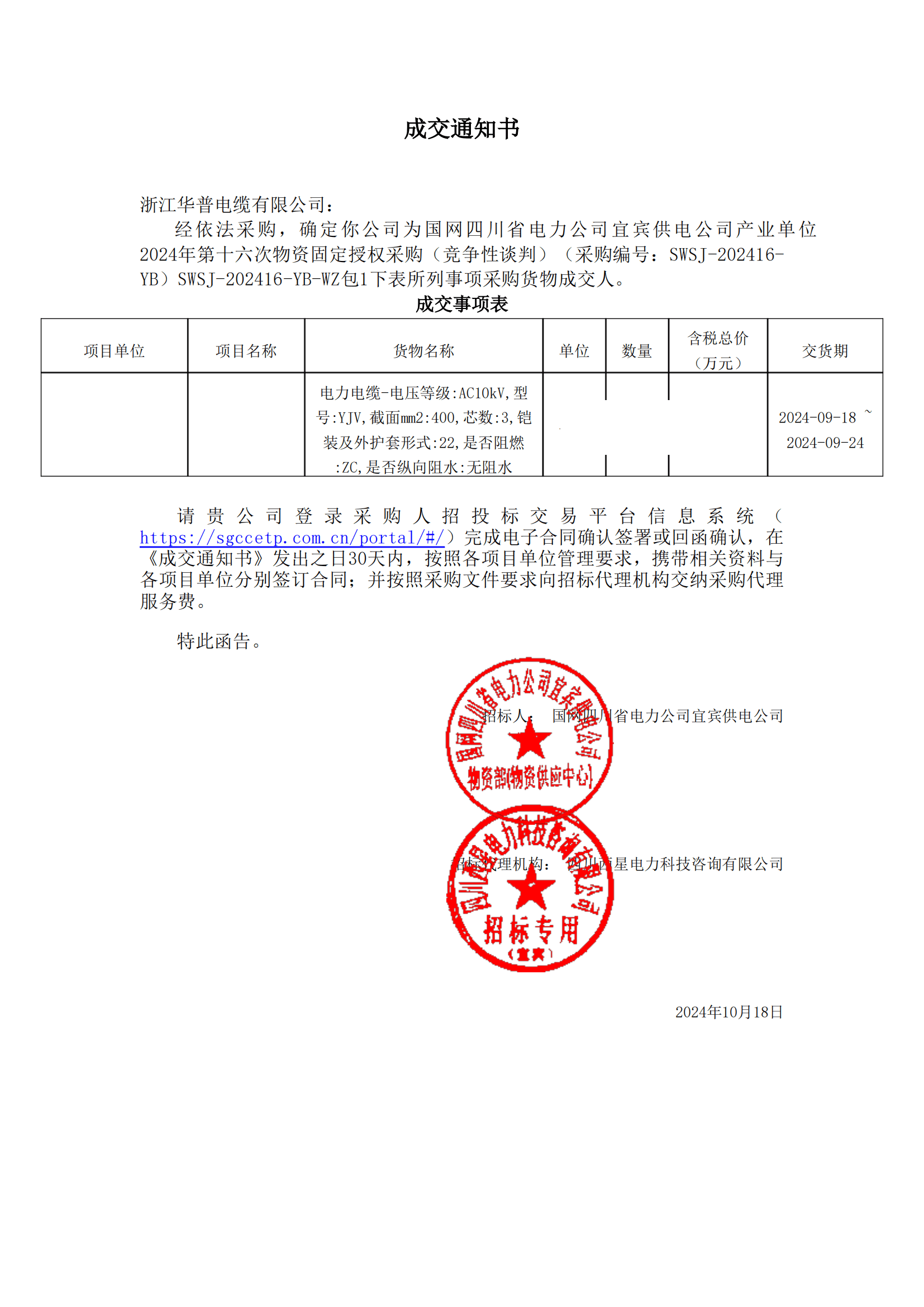 (高压中标通知)国家电网四川电力公司宜宾供电公司工业部门2024年第16次固定授权采购材料(竞争性谈判)