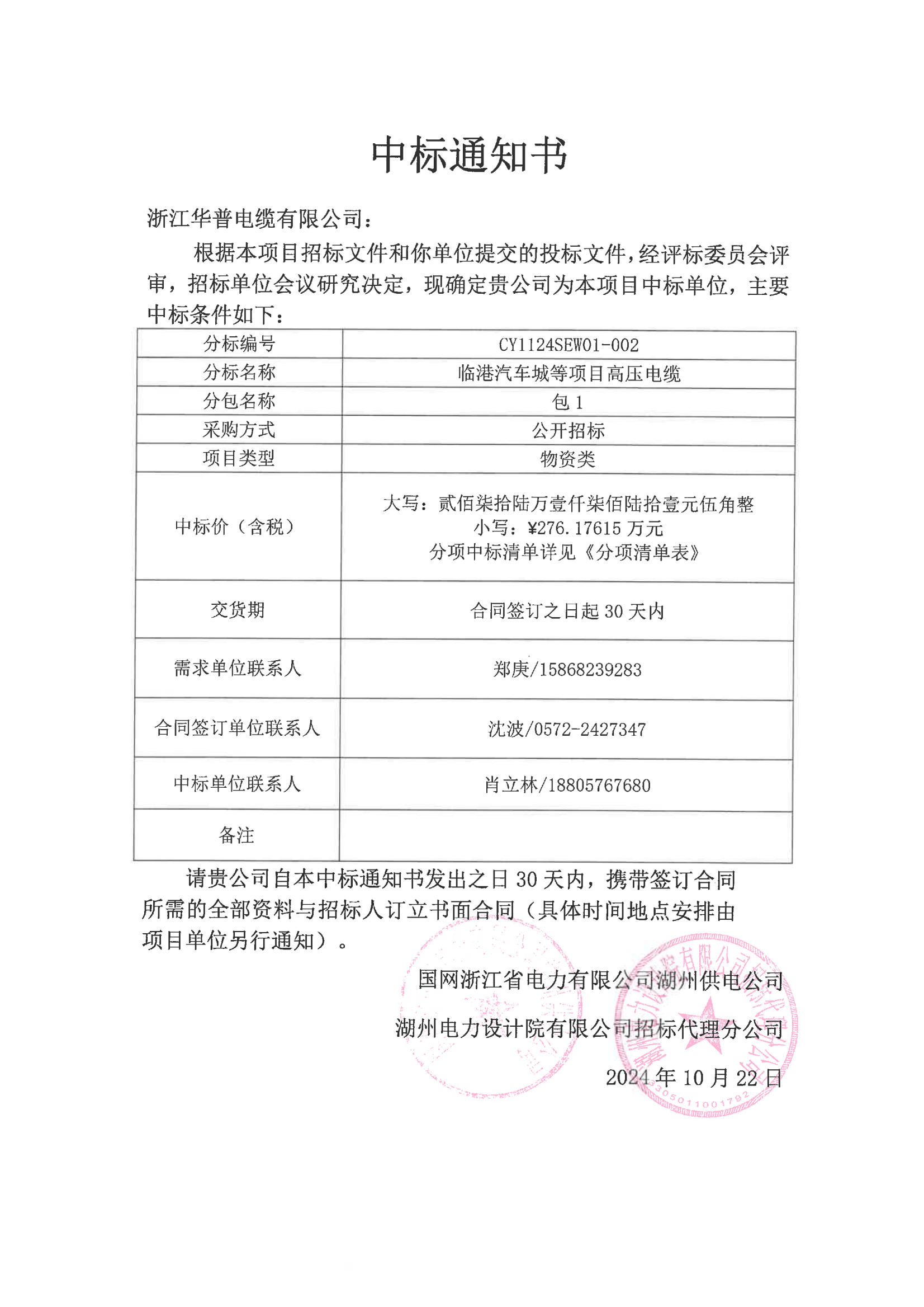 (高压招标中标通知)国家电网浙江电力湖州供电公司2024年第五次授权公开招标采购省级管理行业材料